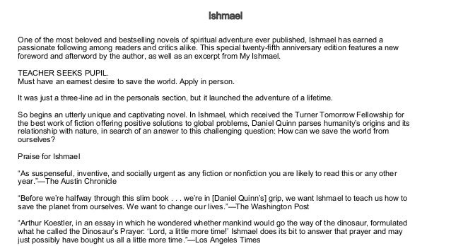 Essay about Ishmael . 1588 Words7 Pages . Ishmael Daniel Quinn's Ishmael is the story of one man's quest for knowledge and his desire to "save the world" . Answering a simple ad in the paper of a teacher looking for students (p4), the narrator is sent on an incredible philosophical journey . The teacher our narrator expects is not that . . .