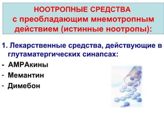«истинные» ноотропы с преобладающим мнестическим эффектом, то есть влияющие на память; нейропротекторы (широкого спектра действия), которые обеспечивают защиту нейронов мозга от различных повреждений .