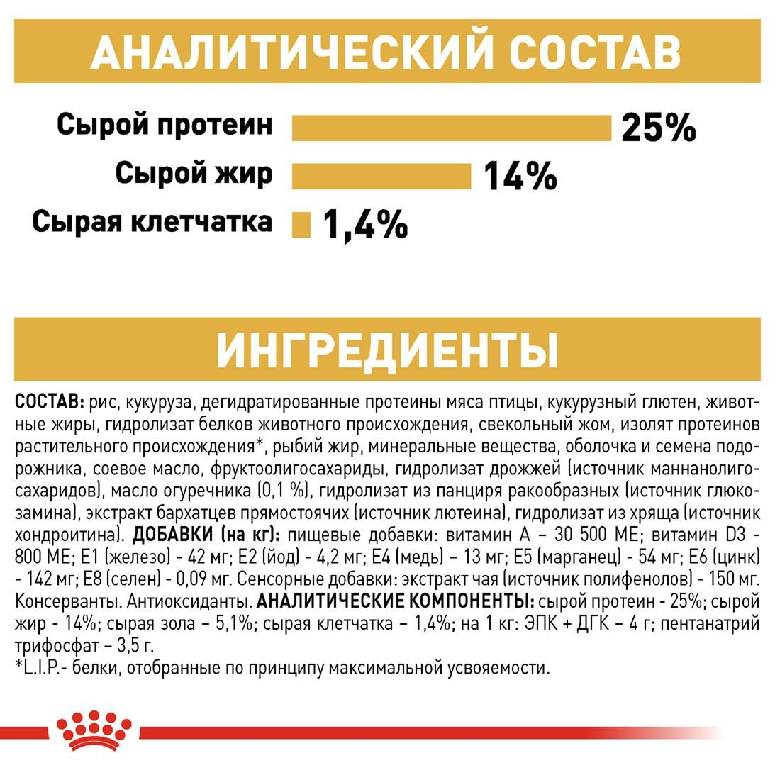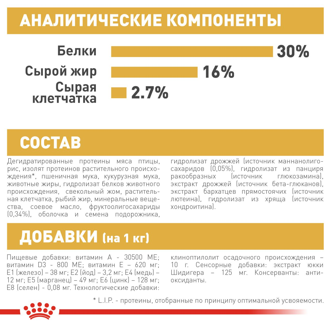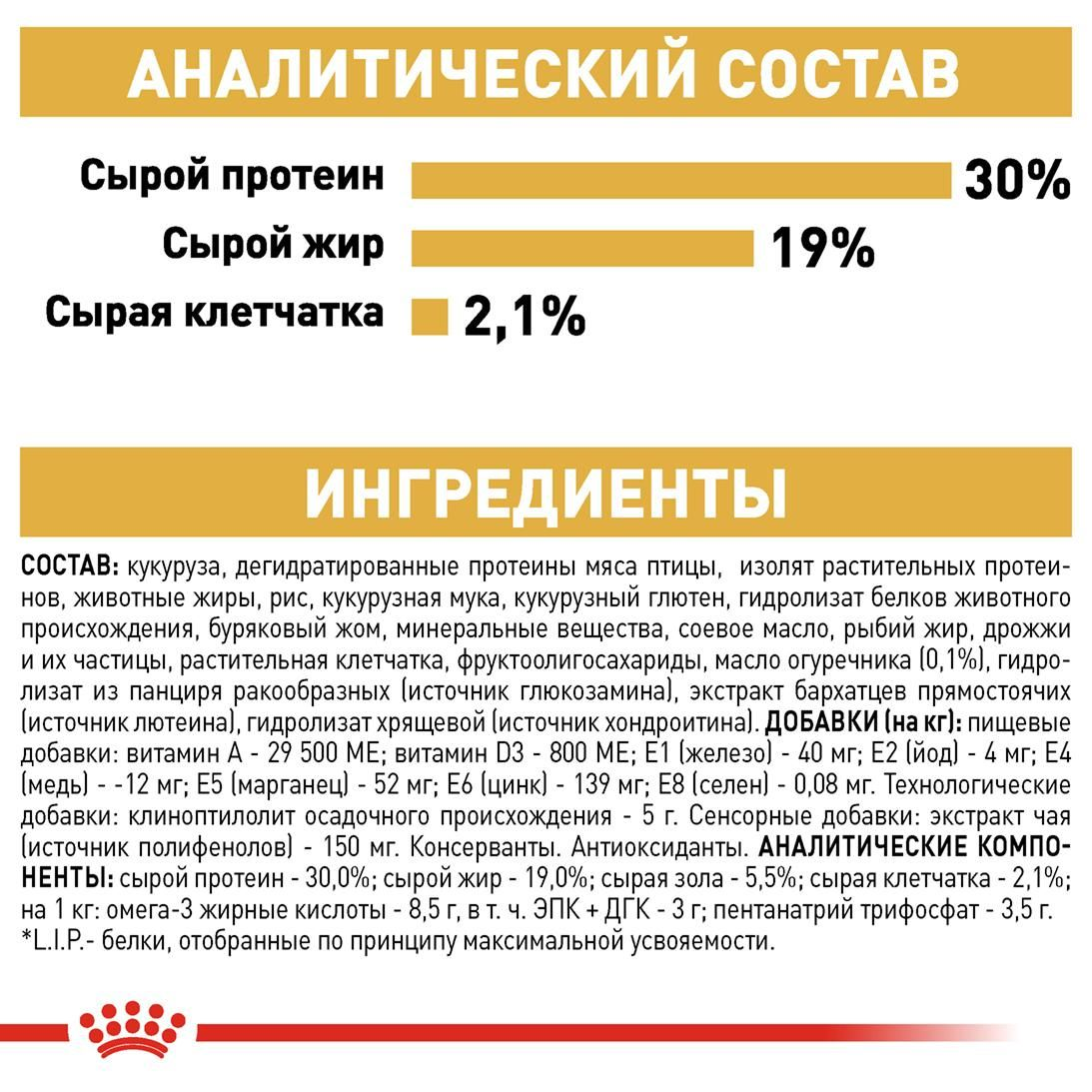 Экстракт бархатцев — источник лютеина, очень полезного для зрения . Экстракт цикория — источник пребиотика инулина, полезного для пищеварения . Пивные дрожжи — источник витамина B-группы . Семя льна — источник клетчатки, ненасыщенных жирных кислот . Свекольный жом — источник клетчатки . Юкка Шидигера — уменьшает запах экскрементов .