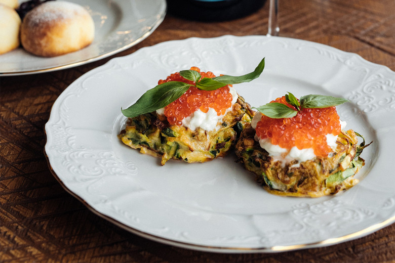 Оладьи из цукини со страчателлой и красной икрой