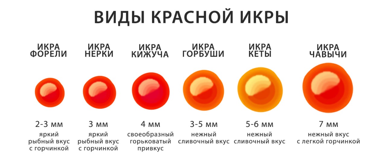 Цвет и размер икринок действительно довольно сильно различаются в зависимости от того, из какой рыбы их добыли. Расскажем о каждой, чтобы вам было проще ориентироваться.