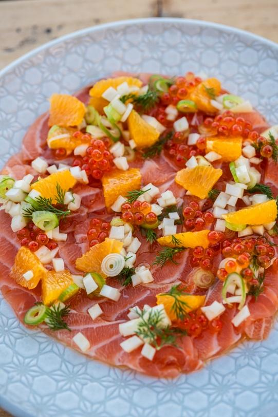 Сашими с фенхелем, цитрусовым соусом и красной икрой