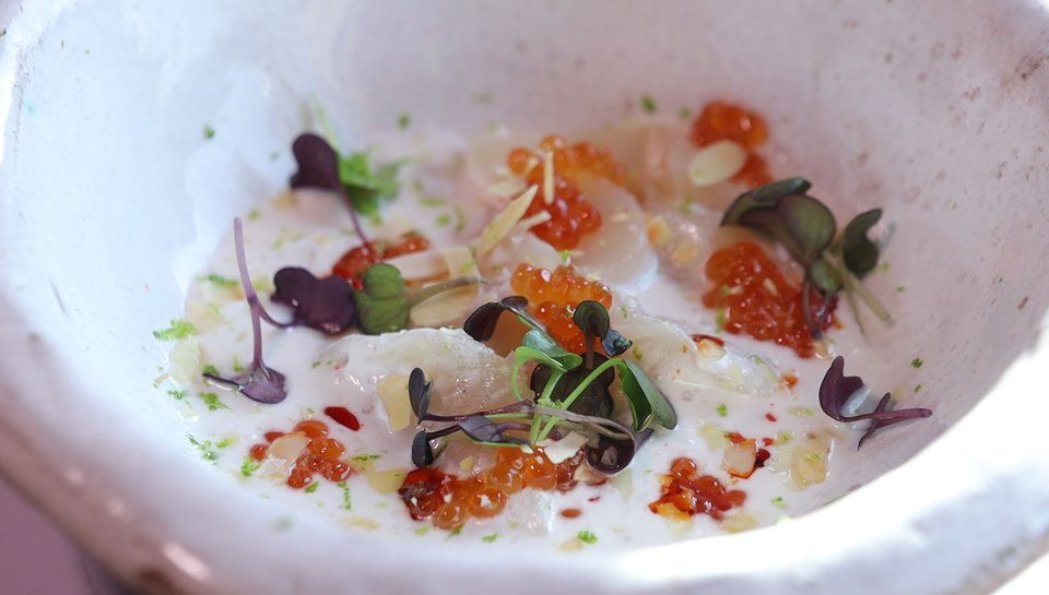- Нарежьте тонкими пластинками филе гребешка. Посолите немного и залейте приготовленным соусом "Тигрового молока" так, чтобы видны были кусочки рыбы.