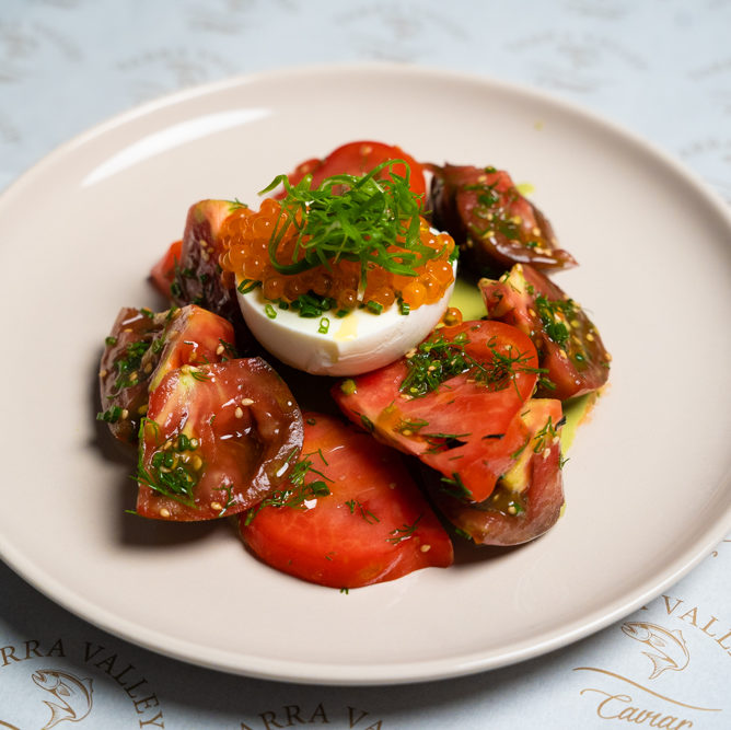 - Завершите блюдо, посыпав его икрой из лосося, укропом и добавив немного оливкового масла.