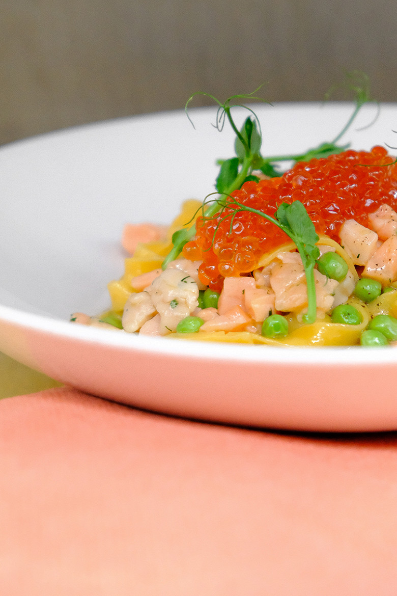 - В центр тарелки выложите теплое пюре из зеленого горошка, сверху наложите приготовленную пасту. Положите сверху красную икру и украсьте луком-сибулетом или зеленью. Наслаждайтесь великолепным блюдом
