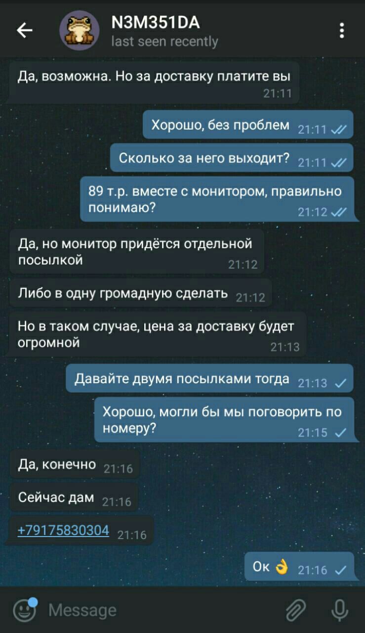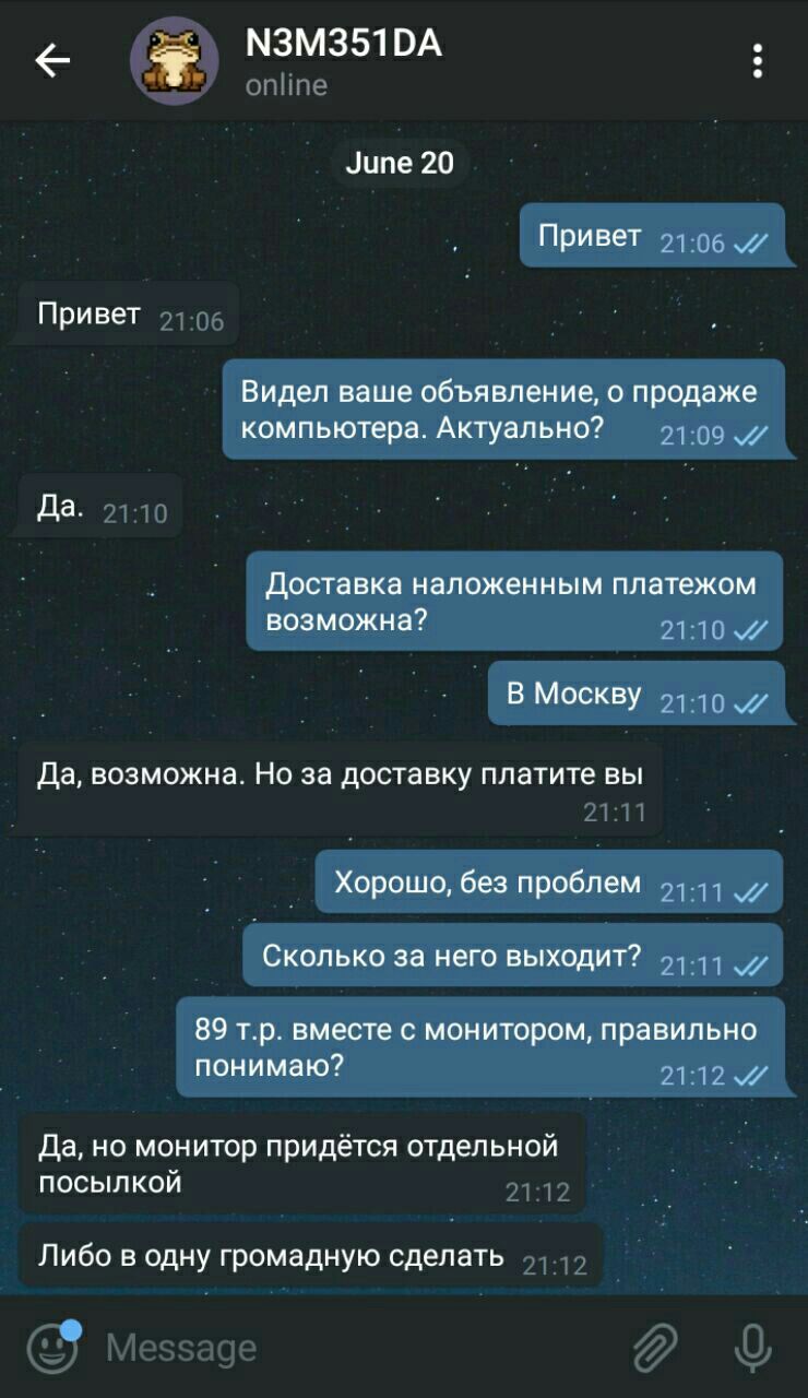 В общем, всё началось с того, что я хотел обновить себе железо в компе. По наводке знакомого, узнал об паблике (ещё давно). Вскоре увидел объявление, о продаже компьютера. Цены были сладкие, наверное на 30-35% ниже рыночной. Написал по контакту в посте, начался диалог. Прикладываю скриншоты.
