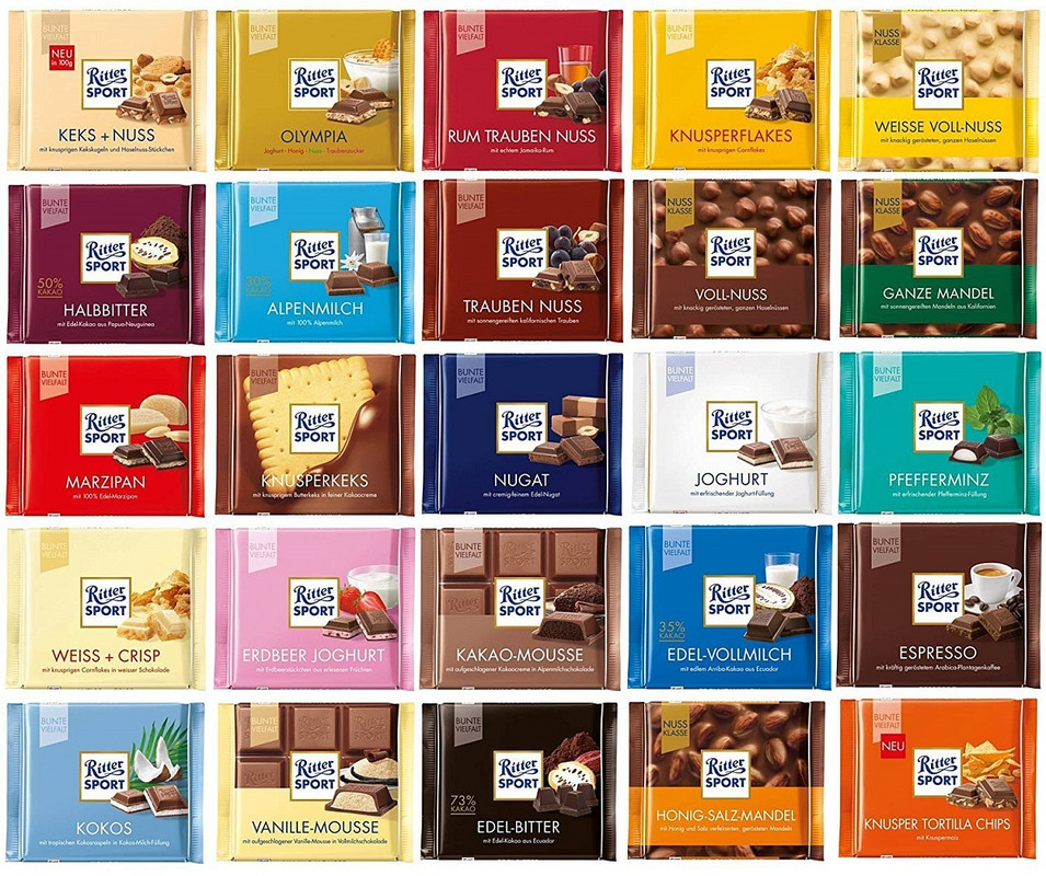 На сегодняшний день бренд Ritter Sport представлен различными видами шоколада с разными начинками, в том числе органическим и веганским шоколадом и миниатюрными плитками.
