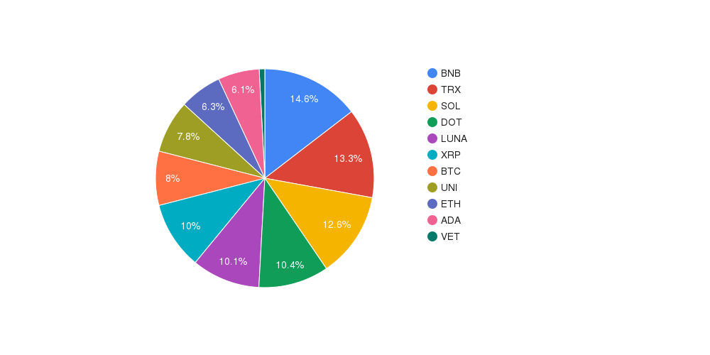 Текущий состав портфеля: BNB - 14,58% TRX - 13,28% SOL - 12,62% DOT - 10,39% LUNA - 10,10% XRP - 10,02% BTC - 7,99% UNI - 7,80% ETH - 6,28% ADA - 6,11% VET - 0,83%