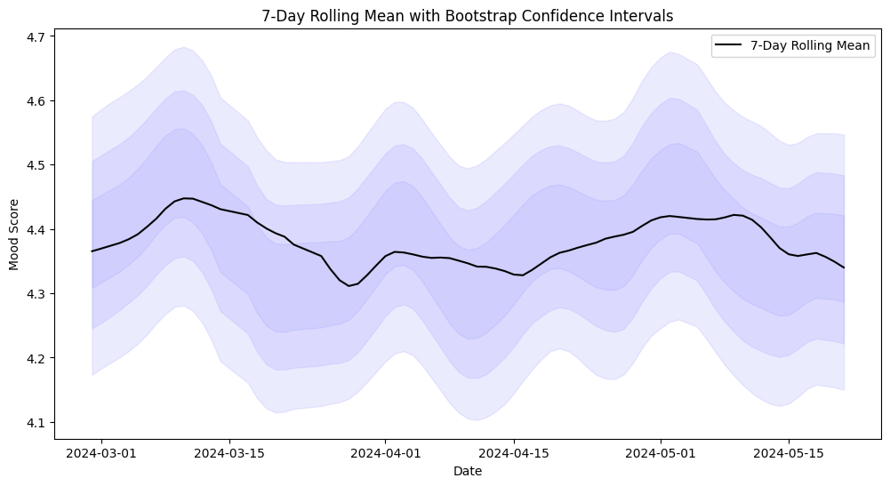 К сожалению, полученные данные очень шумные. Для получения данных трендов пришлось применять многократное усреднение имеющихся данных, что позволяет использовать их исключительно для анализа медленных (T > 7 дней) изменений в настроении студентов. Не меньшее опасение вызывает огромный доверительный интервал. Из-за этого мы не можем достоверно сравнивать количественное значение позитивных и негативных периодов студенчества и можем только качественно оценивать в низкой или высокой точке мы сейчас находимся.