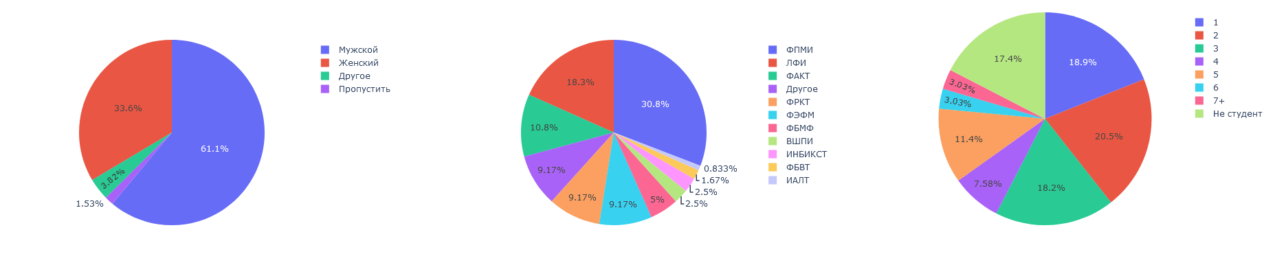 Вопросы о принадлежности к полу, ФШ и курсу задаются пользователям перед подпиской на ежедневные опросы. Проверить корректность предоставленных данных у меня нет возможности. Тем не менее, общее распределение пользователей по демографическим категориям близко к документальным данным о распределении студентов в МФТИ. Исключения составляют малые ФШ и подозрительно низкое количество пользоватлей с ФБМФ (5% пользователей при ~10% студентов МФТИ). Стоит заметить, что "5%" это 6 человек, из которых примерно 3 были в индивидуальном порядке приглашены Админом, что ещё больше увеличивает подозрительное малое количество.