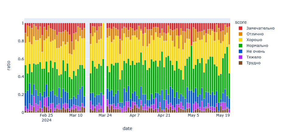 Цвета на графике опросов соответсвуют ответам в опросе. Экспериментально ответы Хорошо и Нормально являются центральными значениями шкалы и являются нормльным уровнем для большинства пользователей.