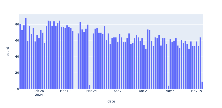 Первая публикация о существовании Настеньки была выложена в сообществе МКИ в ВК и канале МКИ в ТГ 15 февраля. Эта дата выбрана как начальная точка дальнейшего анализа, как время высокой активности. Дополнительный интерес представляет точка 1 марта — в этот день в кампусе МФТИ были развешены информационные плакаты с напоминанием пройти опрос, ссылкой на бота и дополнительную информацию о мотивировании участников призом за стабильное прохождение опросов.