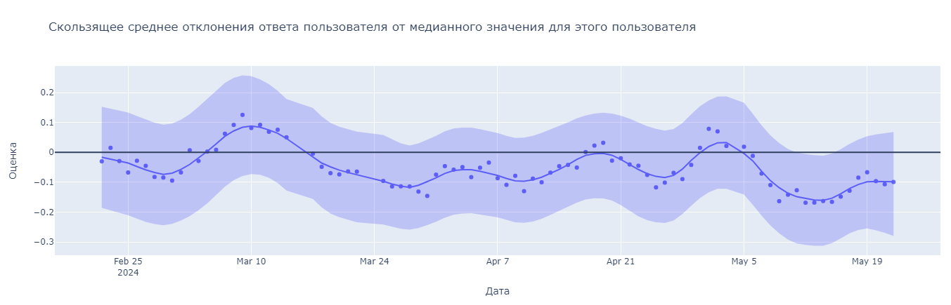 Данный график включает в себя несколько шагов сглаживания и усреднения для наблюдения линии тренда: отклонения считается в среднем по всем пользователям за каждый день, затем полученные суммы усредняются скользящим средним за 7 дней (точки = результат усреднения), для проведения линии тренда использовалась функция LOWESS. Доверительный интервал с p-value=0.05 был построен методом bootstrap.