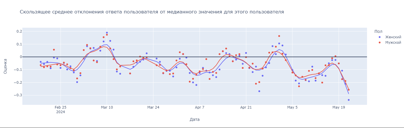 Дополнительно были построены тренды для только мужчин и женщин среди отвечающих. Примечательно, что линии тренда практически совпадают. Это может говорить как о равном влиянии окружения Физтеха на студентов вне зависимости от их пола, так и статистической значимости наблюдаемого тренда.