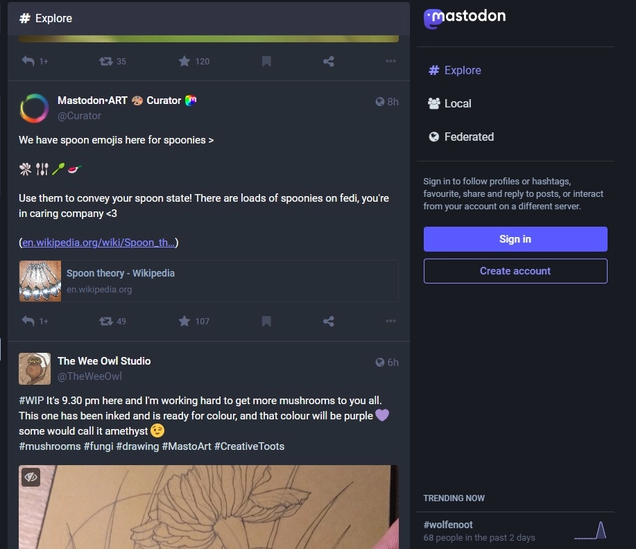 Важно: Mastodon.art – не самый быстрый в плане регистрации сервер, и на момент написания данного текста регистрация новых пользователей была недоступна. Как только администрация разберётся с теми, кто успел подать заявку во время недавнего всплеска интереса к Mastodon, регистрация возобновится.