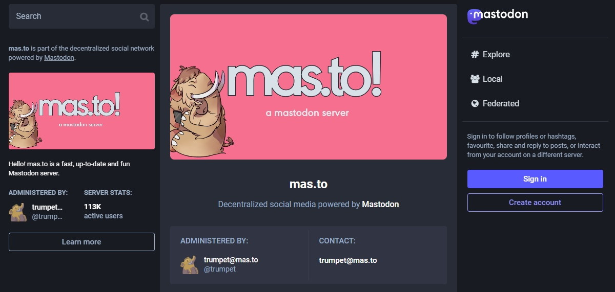 Важно: Mas.to не справился с резко выросшей популярностью Mastodon, и на момент написания данного текста регистрация новых пользователей была временно приостановлена. Однако старые учётные записи всё ещё активны, так что вы в любом случае можете погулять по серверу и поискать что-нибудь интересное. Скорее всего, совсем скоро администрация сумеет нарастить мощности и вернёт привычную регистрацию.