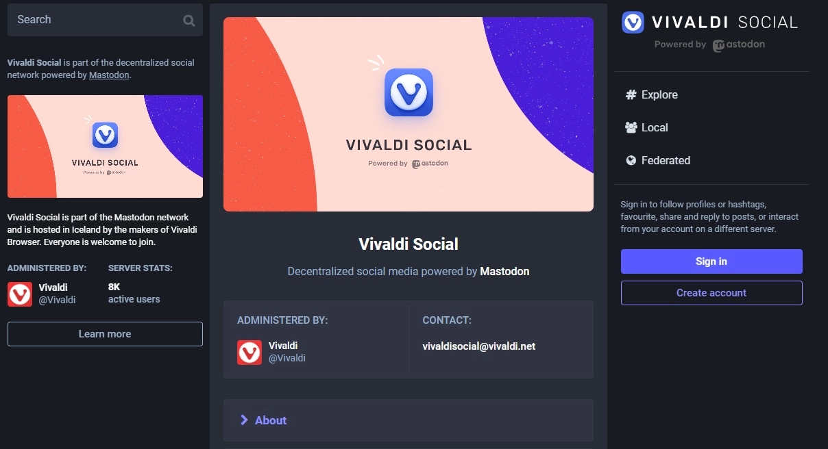 Возможно, вы пока не готовы доверять свои данные энтузиастам. В этом случае вам стоит присмотреться к Vivaldi Social. Это сервер Mastodon, запущенный разработчиками браузера Vivaldi. Приятно видеть, что такие компании, как Vivaldi, тоже вносят свой вклад в развитие технологий с открытым исходным кодом.