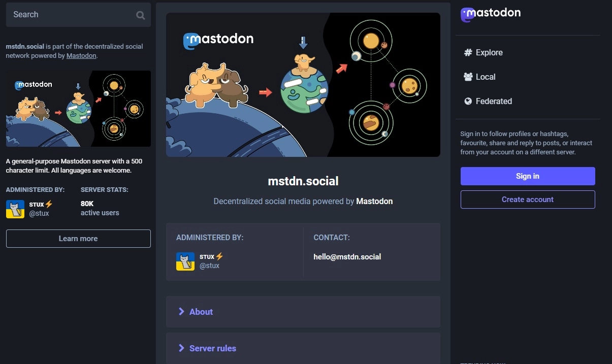 Mstdn.social – один из самых активных серверов Mastdon. Администрация приветливая и позитивная. Конкретной тематики у сервера нет, обсуждайте всё, что душе угодно: технологии, погоду, мемы с котами. Последнее там в особом почёте, и даже админ сервера Stux регулярно постит фотографии своих котов. А что ещё нужно современному интернет-пользователю для счастья?
