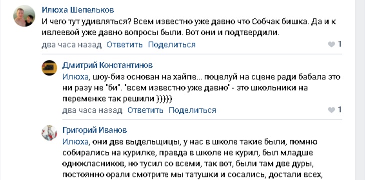 На одном из шоу телеведущей Насти Ивлеевой поприсутствовала известная журналистка и актриса Ксения Собачак . И не просто поприсутствовала, а поднялась на сцену к Ивлеевой . Где девушки решили поцеловаться . Видимо, чтобы как то развлечь толпу .