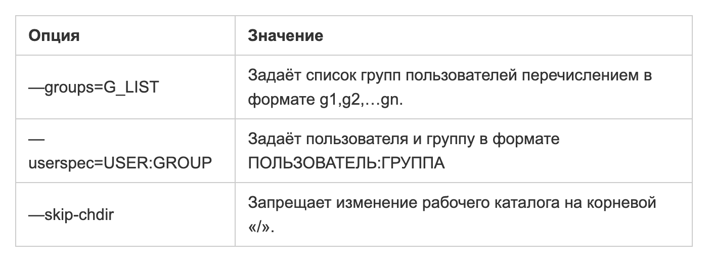Как видно, в качестве NEWROOT указывается новый путь в файловой системе, далее может следовать, собственно, команда со своими аргументами. В следующей таблице перечислены опции chroot, которых не так много: