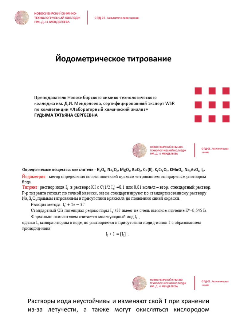 Иодометрия . йодометрия Основой метода измерения йода является полуреакция: lt + 2e-21 «; Fe? a / I = 0,545 В (13,7) Уравнение (13 .7) записано графически, потому что раствор йода KI фактически используется для увеличения растворимости b .