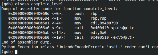Суть этого уровня в том, чтобы передать выполнение на функцию complete_level(), которая никак не вызывается в коде программы.