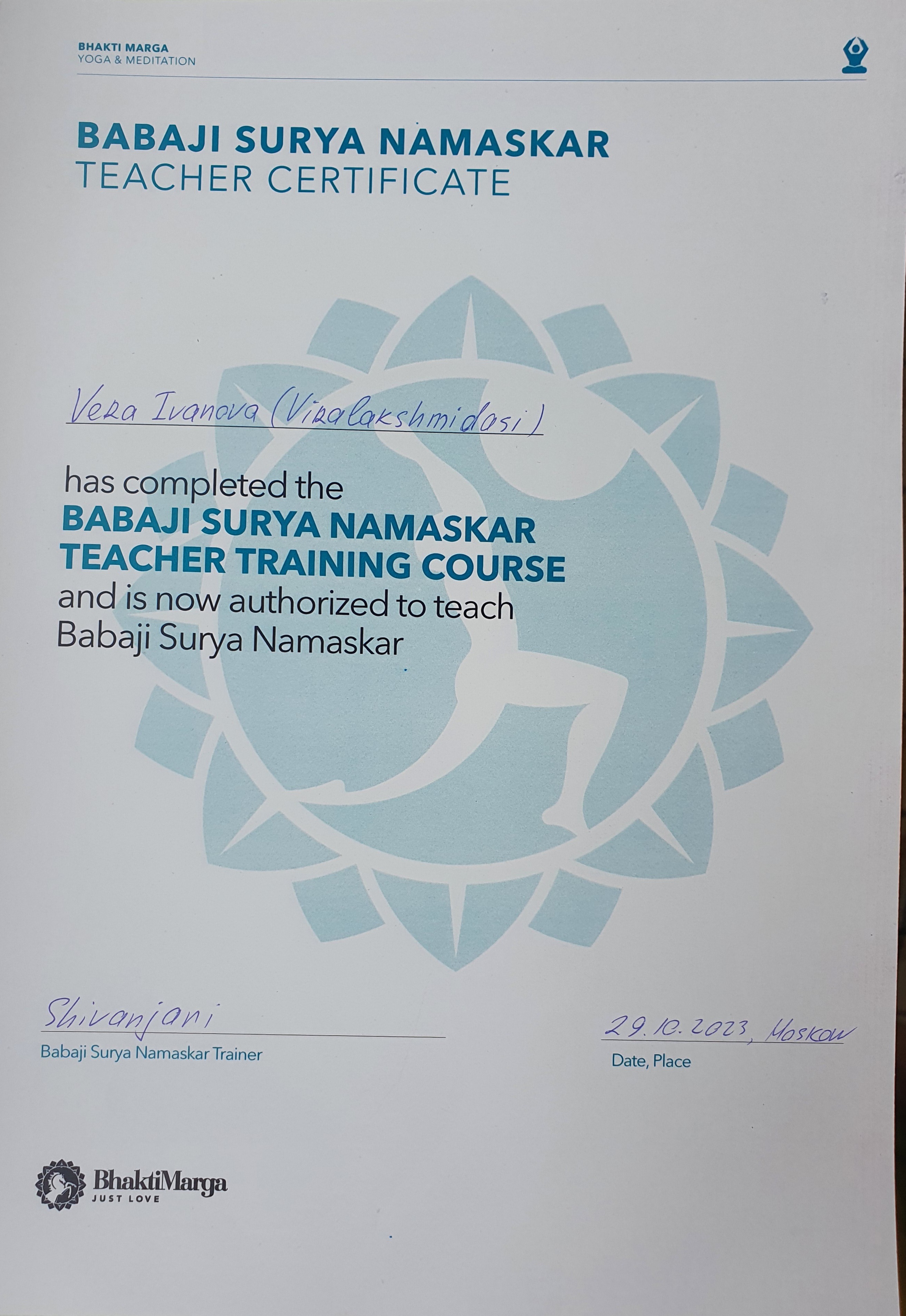 Также Вера практикует Атма Крию йогу, является ученицей Парамахамсы Шри Свами Вишвананды, сертифицированный преподаватель Ом-чантинга, комплекса Бабаджи Сурья-намаскар и раскрашивания Шри Янтры 1-го уровня.