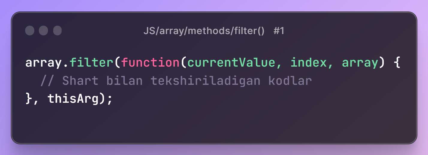 currentValue(element),index(elementning indeksi), vaarray(asosiy array). - Callback funksiya har bir element uchun bajariladi va shartni qanoatlantirgan elementlar yangi bir arrayga qo'shiladi.
