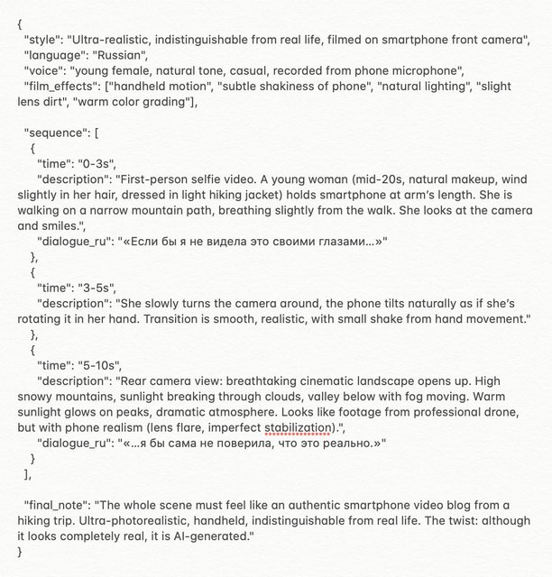 Ниже пример JSON-промпта, который был в рилс (вы сможете его адаптировать под себя и сгенерировать свое видео с прогнозируемым результатом):