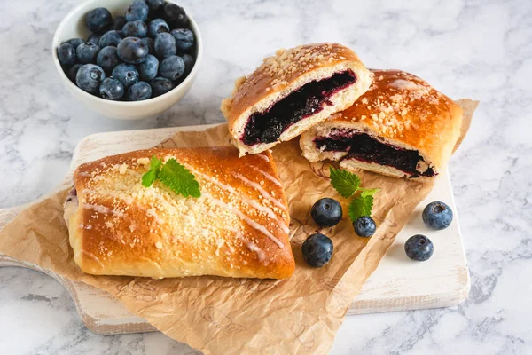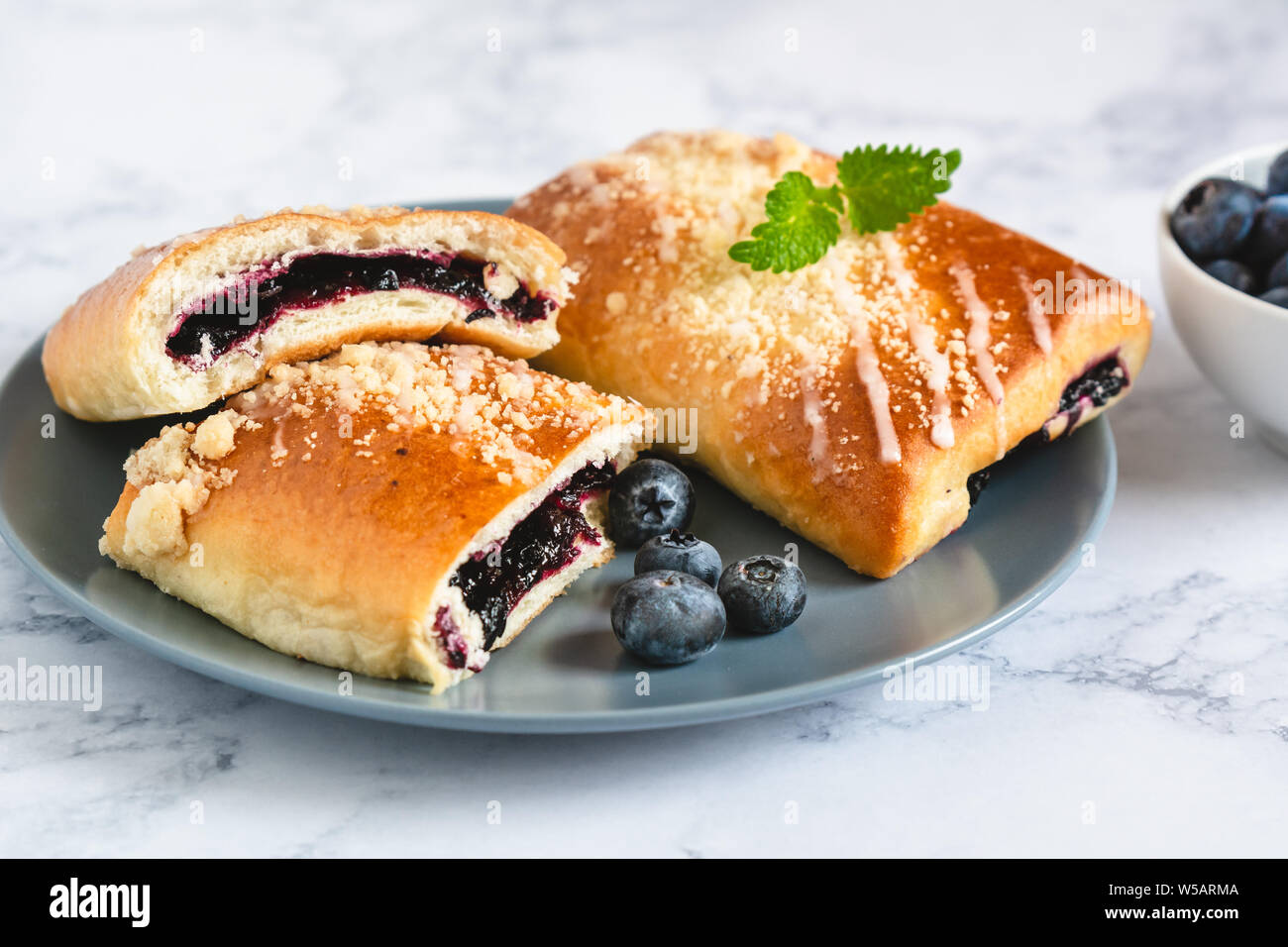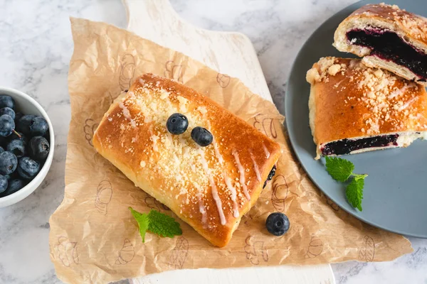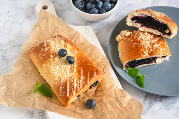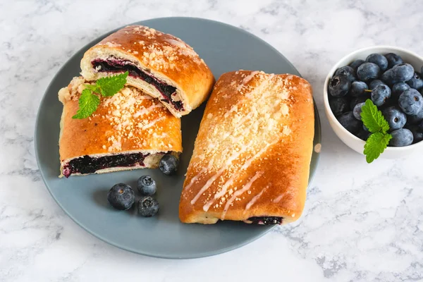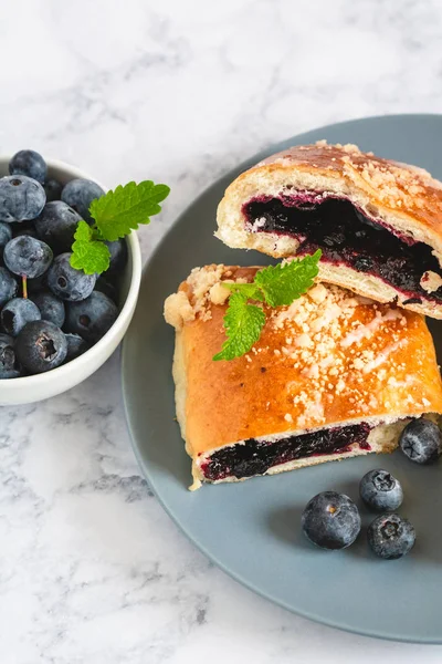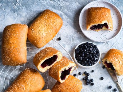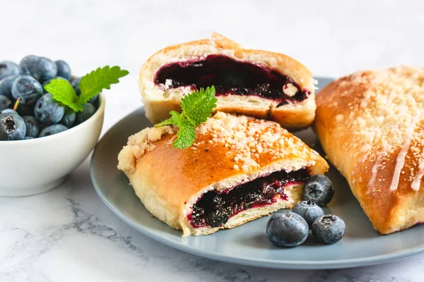 Jagodzianka or Jagodzianki (in plural) are traditional Polish sweet buns filled with blueberries or blueberry jam . They are often topped with a sweet crumbs that works perfectly with taste of sour blueberries . Blueberry buns make perfect picnic food as well as summer breakfast and lunchtime snacks .