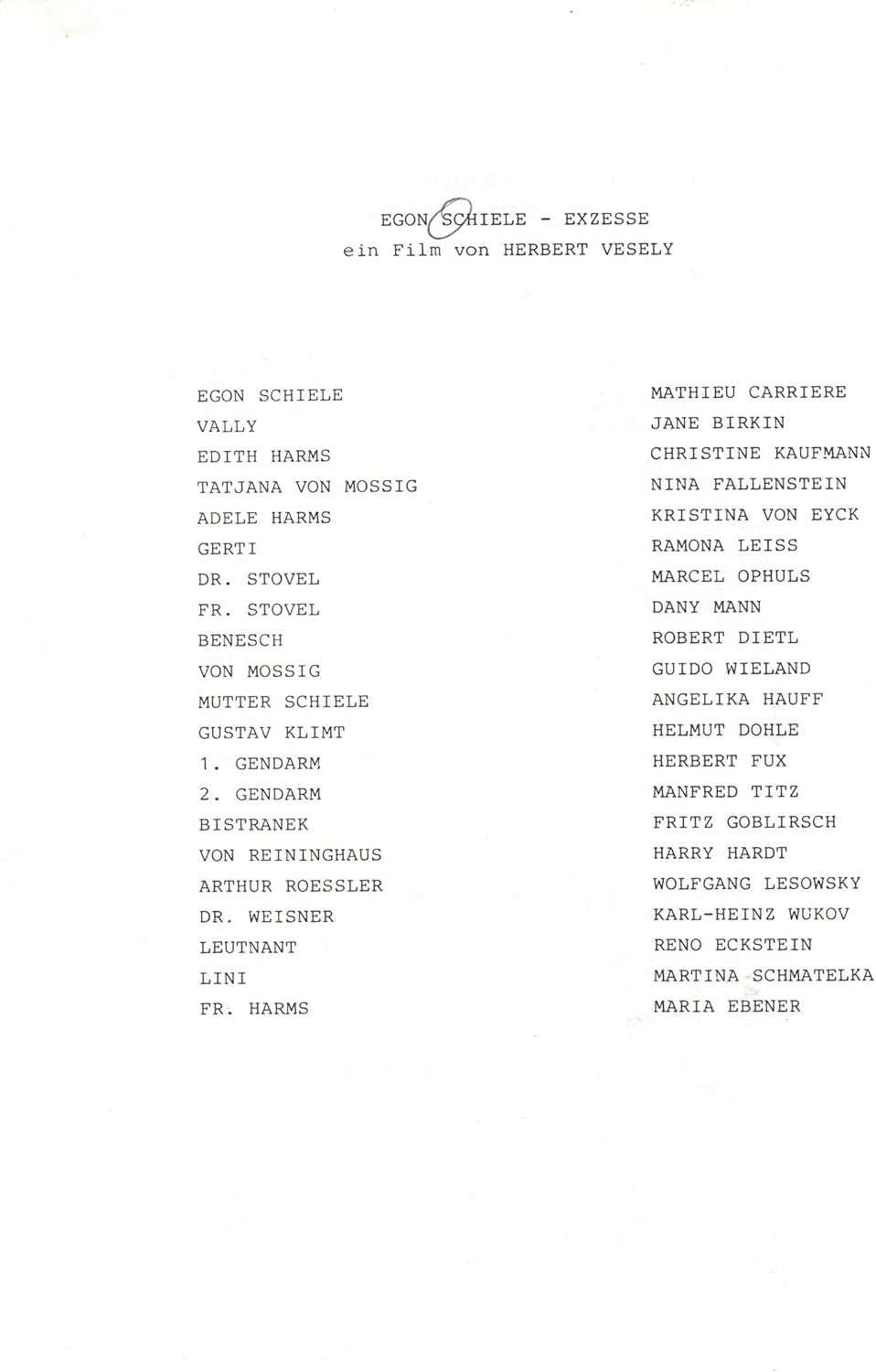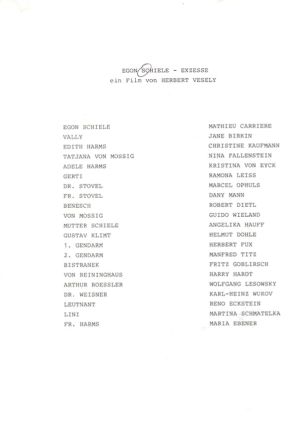 EGON SCHIELE - EXZESS UND BESTRAFUNG (1980) Tweet . Tweet . Film details . Featuring . Mathieu Carrière Jane Birkin Christine Kaufmann . Countries . France Yugoslavia Federal Republic of Germany . Year . 1980 . . . Jane Birkin . Edith Schiele . Christine Kaufmann . . .