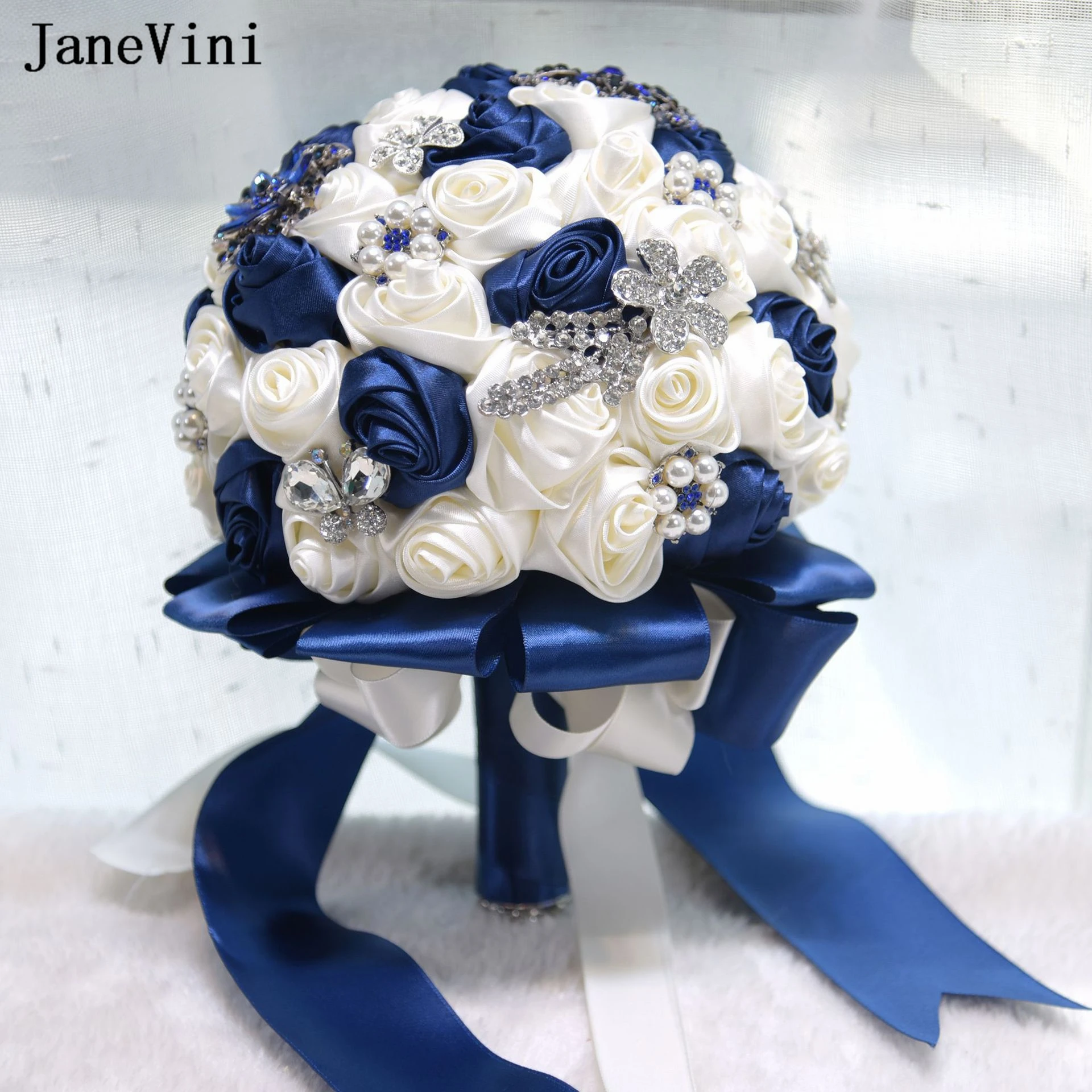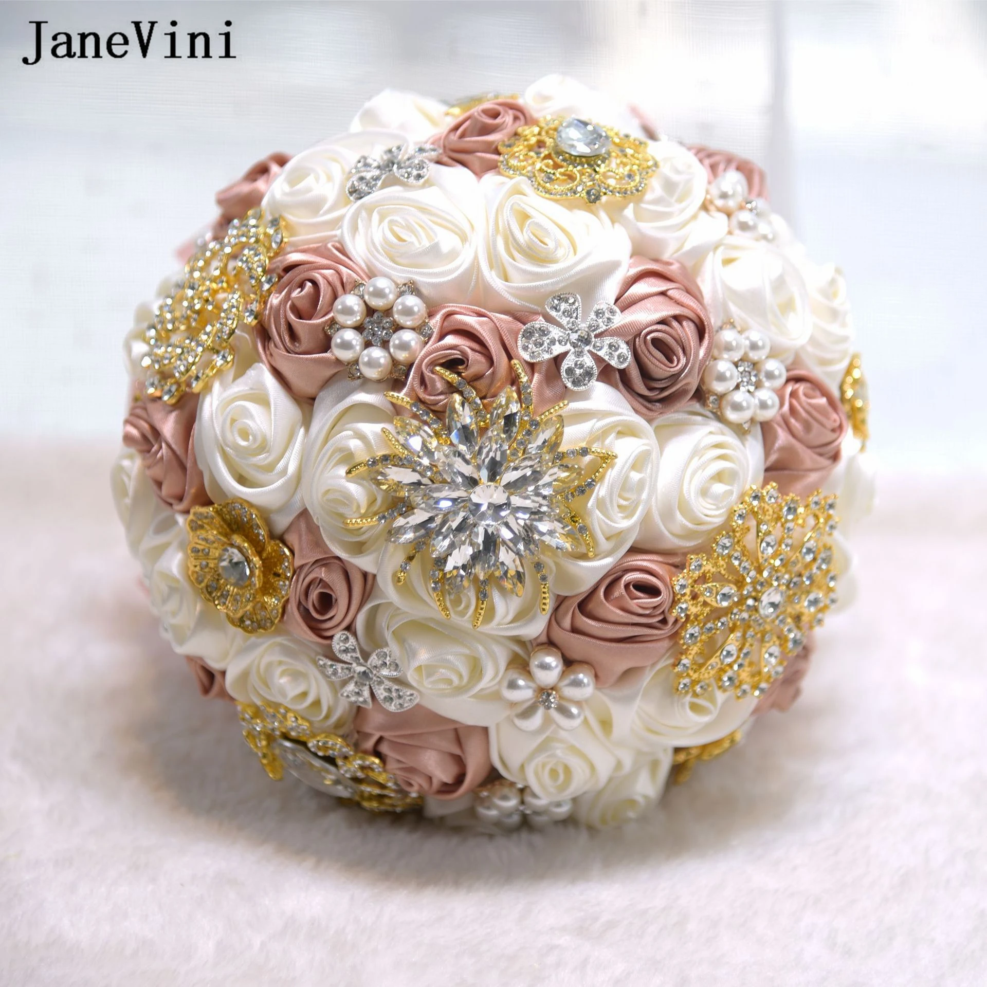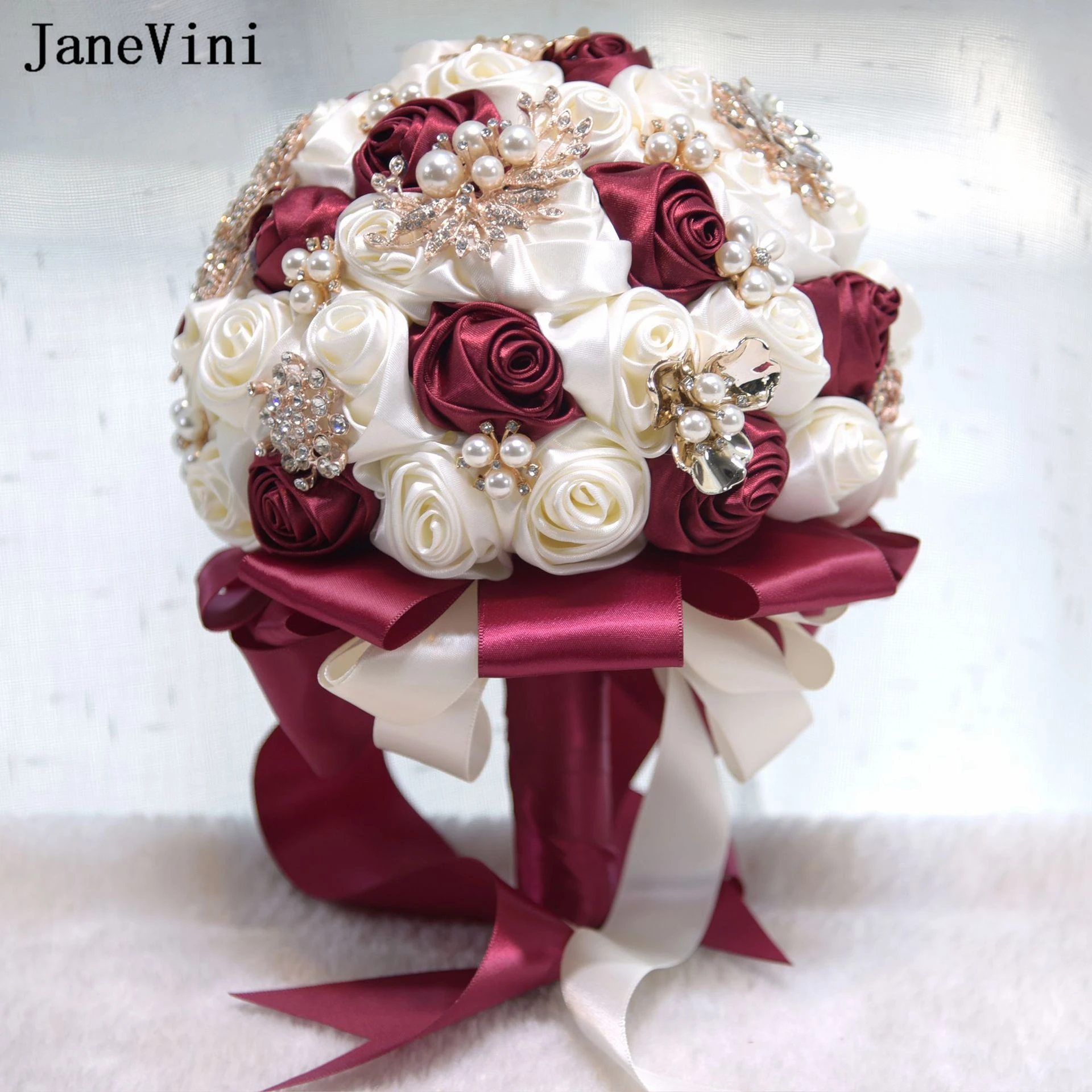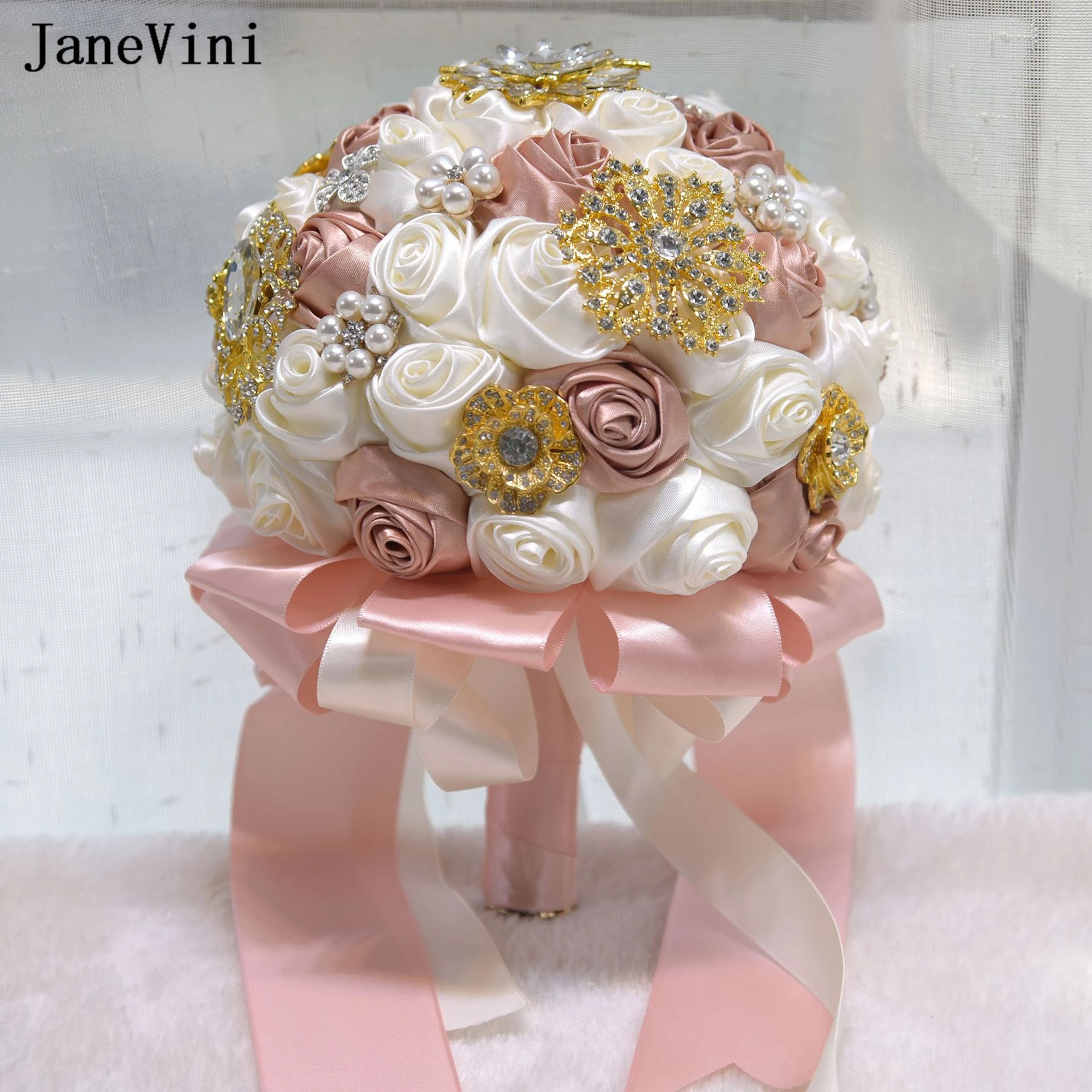 JaneVini 2023 Stunning Ivory Flowers Bridal Bouquets with Rhinestone Pearls Artificial Satin Roses Ribbon Handle Wedding Bouquet - Купить с бесплатной доставкой
