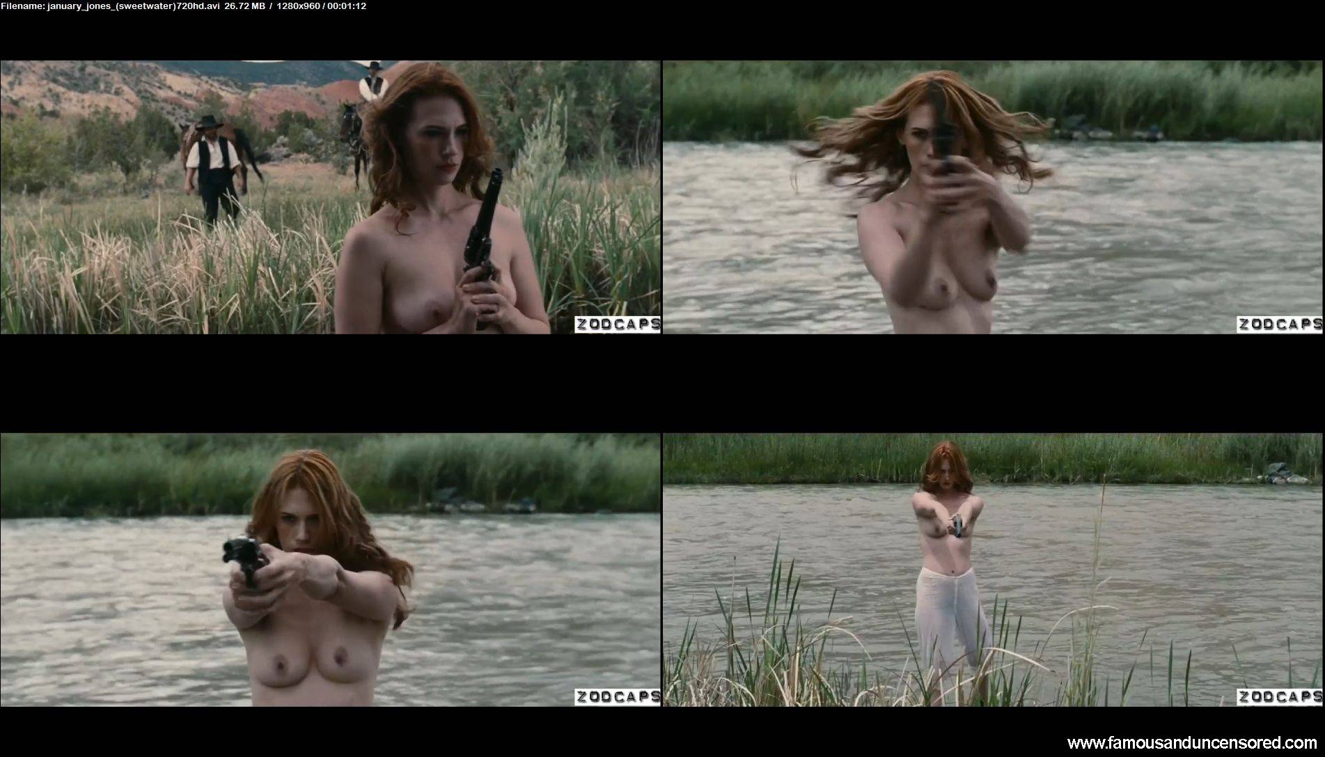 Watch first January Jones’s nude scene from “Sweetwater” (2013), where you can see her small natural tits, when she shoots the men by the river. Jones was a redhead here, so for all ginger lovers, we have The Fappening-style content!