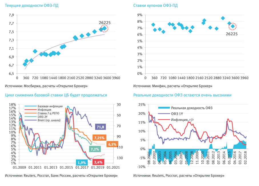 Согласно комментариям Банка России, в ближайшие годы ключевая ставка опустится до 6,5%, соответственно доходности по длинным бумагам имеют потенциал снижения около 150 б.п. Если вы верите банку России — можно смело брать. Правда если вопреки прогнозам регулятора инфляция начнет расти, снижение рыночной стоимости облигаций в теории может съесть часть купонного дохода.