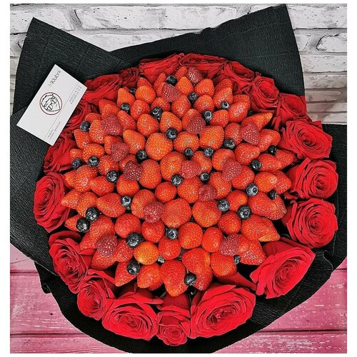 Un bouquet de fraises chic avec l'ajout de framboises et de myrtilles encadré de roses. Topper, carte postale avec votre texte en cadeau.Un bouquet de fraises chic avec l'ajout de framboises et de myrtilles encadré de roses. Topper, carte postale avec votre texte en cadeau.