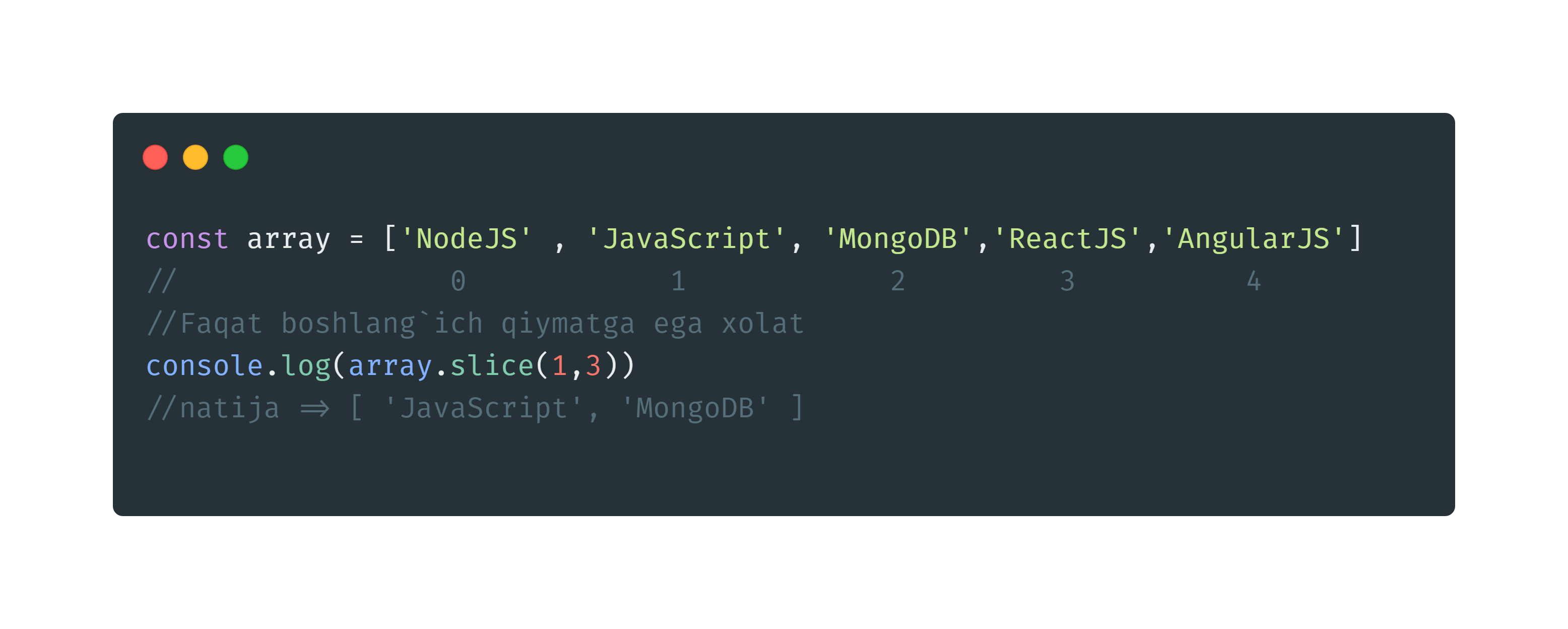 Agar ikkinchi qiymat berilgan taqdirsa metod shu oxirgi qiymatgacha qabul qiladi , oxirgi qiymatni qabul qilmaydi. Masalan: array.slice(1,3). Bu xolatda dastur 1 dan 3 gacha orqaliqdagi qiymatlarni qabul qiladi, 3 elementni qabul qilmaydi (3-rasm)