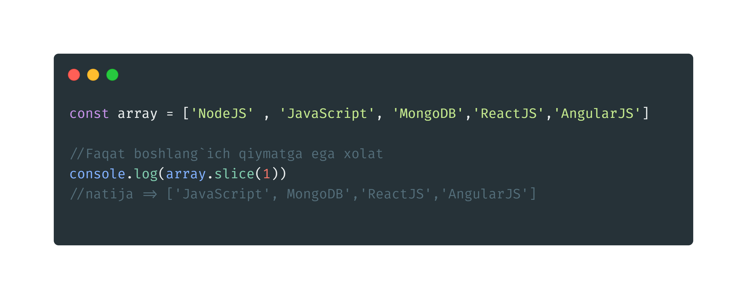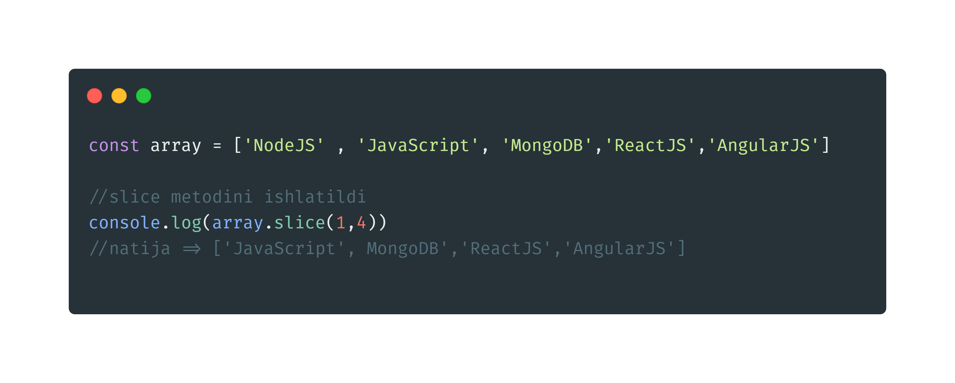 slice() metodi o`ziga ikkita parametr qabu qiladi. start va end ( ya`ni boshlang`ich va oxirgi qiymat). Agar metodga ikkinchi parametr berilmasa boshlang`ich elementdan to massivning oxirgi emlementigacha qabul qiladi. ( 2-rasm )