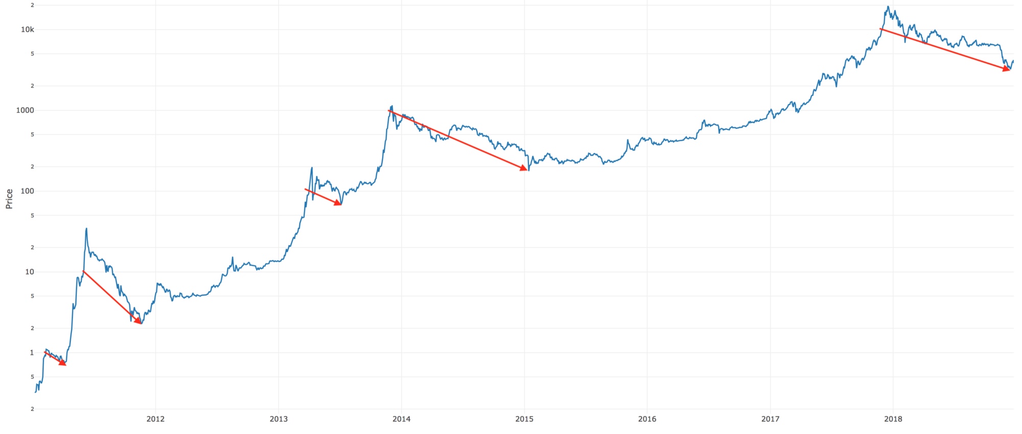 Биткоин вырос в несколько раз всего за несколько лет. Вы могли слышать, что 2018 стал «зимой для криптовалют», и наверняка думаете, что эта сфера столкнулась с проблемами. Ерунда. Что случилось на самом деле: в конце 2017 Биткоин достиг очередного пика, и рынок немного отыграл назад. Такое происходит при каждом достижении десятикратного рубежа стоимости.