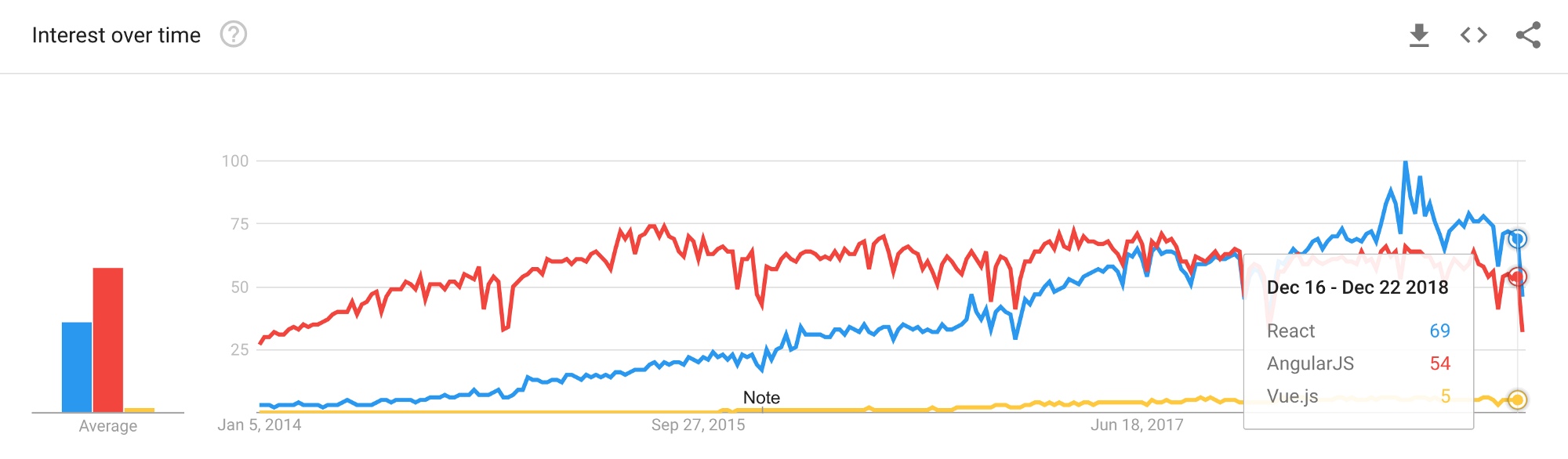 По поисковым запросам React обогнал Angular в январе 2018 и сохранял лидерство на протяжении всего года. Vue.js стал занимать видимую, но все еще относительно незначительную позицию. Для сравнения, прошлогодние результаты: