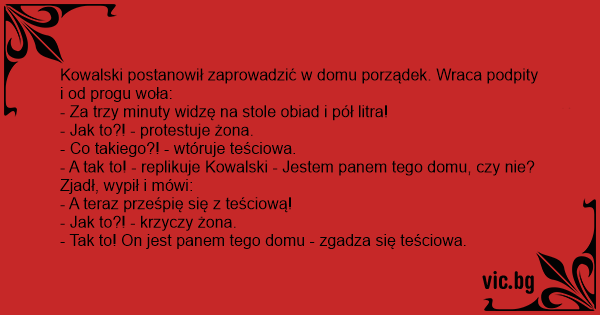 - A tak to! - replikuje Kowalski - Jestem panem tego domu , czy nie? Zjadł, wypił i mówi: - A teraz prześpię się z teściową! - Jak to?! - krzyczy żona . - Tak to! On jest panem tego domu - zgadza się teściowa . Udostepnij Stały link
