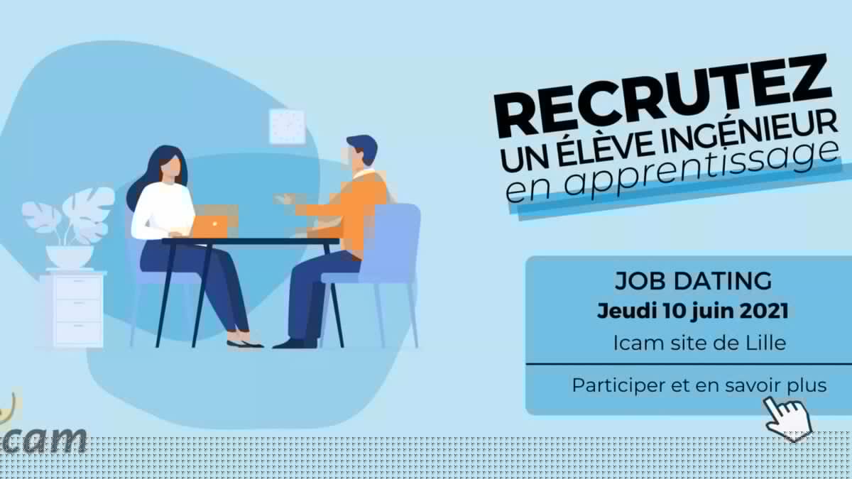 Présentation du Job Dating : Au sein d'un espace dédié, le job dating permet une rencontre entre un recruteur et un futur collaborateur pour échanger sur des projets de recrutement (stage, contrat d'apprentissage ou embauche) . Il s'agit de créer un premier contact lors d'un entretien de 15 minutes .