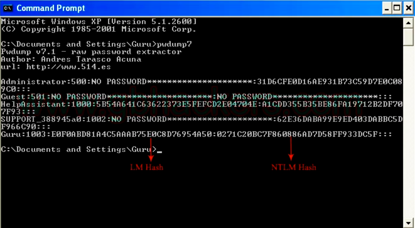 Pwdump - это простой и удобный инструмент для получения хэшей секретных слов LM и NTLM локальных клиентских учетных записей от Security Account Manager (SAM).