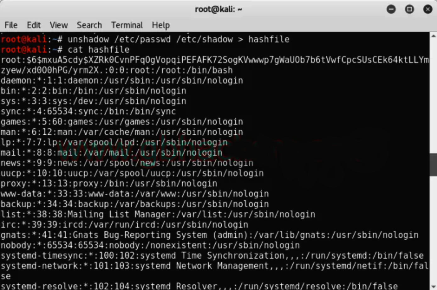 root@kali:~# unshadow /etc/passwd /etc/shadow > hashfile