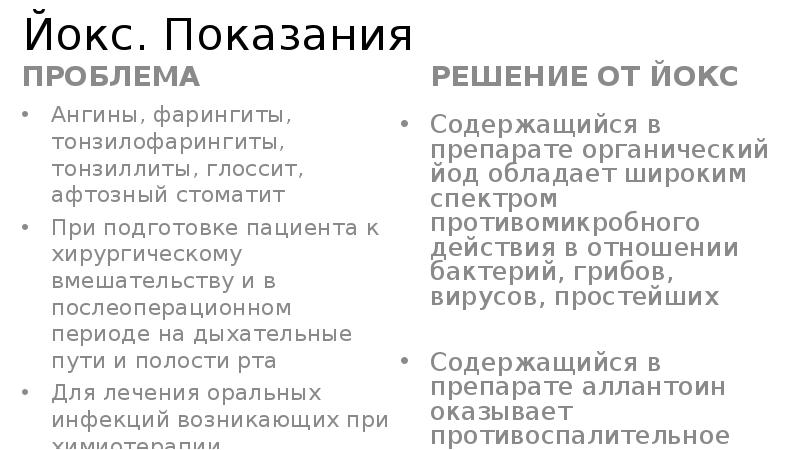 Показания . Основные показания препарата Йокс: заболевания глотки и полости рта инфекционно-воспалительного характера (в т .ч . афты, стоматиты, глосситы, тонзилофарингиты, тонзиллиты, ангины);