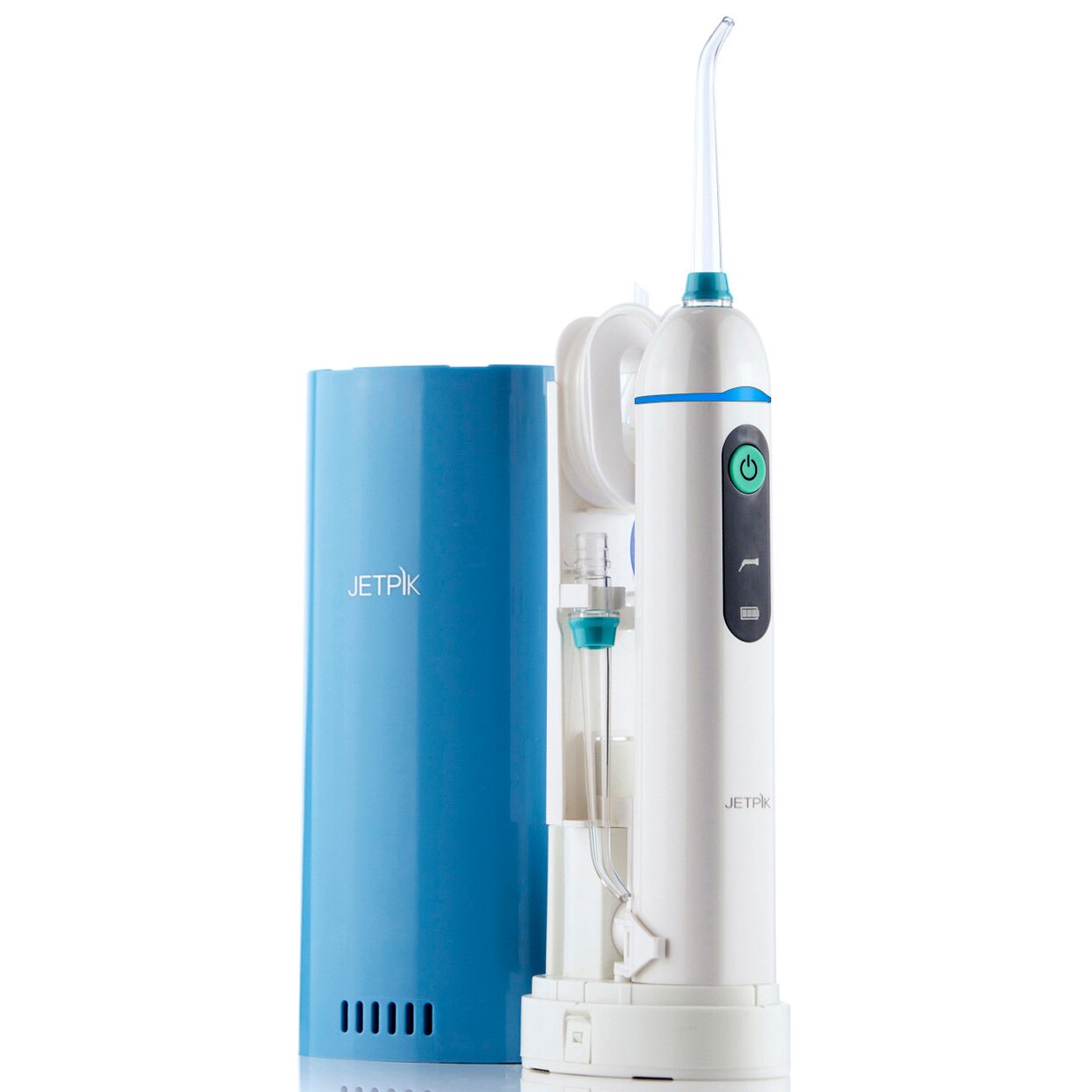 Jetpik JP50 SOLO имеет эргономичный бокс-стакан, который не только служит кейсом для хранения аксессуаров, но и выполняет функцию емкости для воды. Благодаря емкому литиевому аккумулятору ирригатор способен длительное время работать без подзарядки.