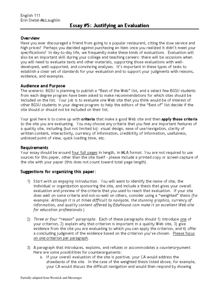 Original Essays: Justifying an evaluation example essay . . .