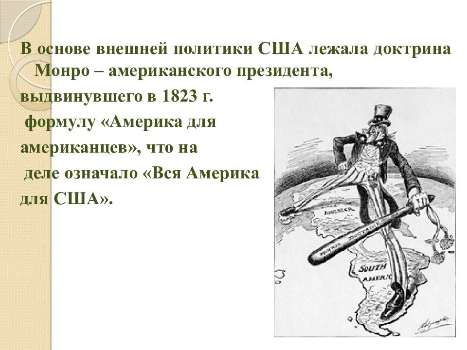 США к этому времени почувствовали возможность претендовать на гораздо более значительную роль в международных отношениях. И когда появились планы Священного Союза подавить революции в Латинской Америке и, следовательно, вернуть эти территории в колониальное состояние, Соединенные Штаты встрепенулись. Их планы исключали такой вариант. И вот 2 декабря 1823 года в послании президента Монро Конгрессу была озвучена доктрина, названная его именем, хотя фактически разработал этот комплекс идей Джон Куинси Адамс (сын Джона Адамса, второго президента США), занимавший на тот момент пост государственного секретаря, и вскоре ставшего президентом страны (1825-1829). Суть доктрины была формально не сложной: американцы не вмешиваются в дела Восточного полушария планеты, а в Западном всем заправляют Соединенные Штаты.