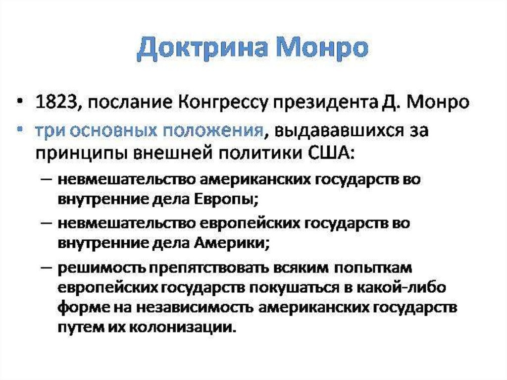 «Было сочтено уместным утвердить в качестве принципа, затрагивающего права и интересы Соединенных Штатов, что американские континенты в силу свободных и независимых условий, которые они приняли и поддерживают, отныне не должны рассматриваться как объекты будущей колонизации какими-либо европейскими державами».