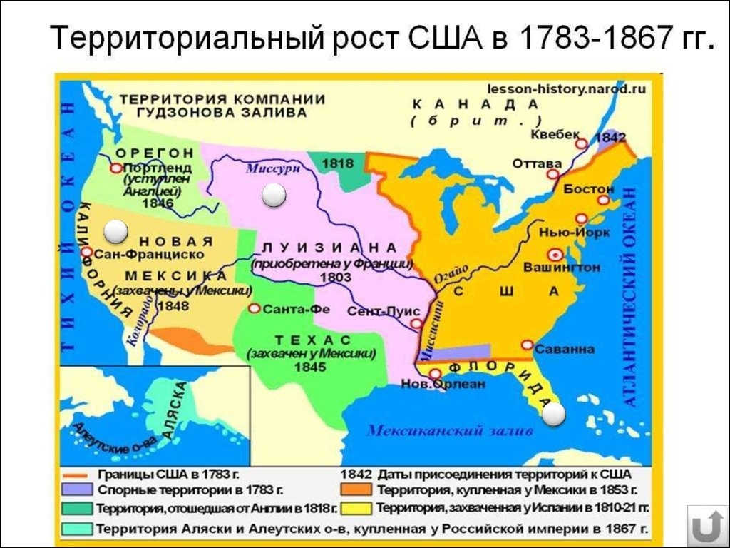 А еще федеральное правительство США активно вело войны с индейскими племенами. В итоге покупок, завоеваний, захватов, уступок Штаты к 1823 году имели территорию более чем в половину от современной. Смотрите карту.